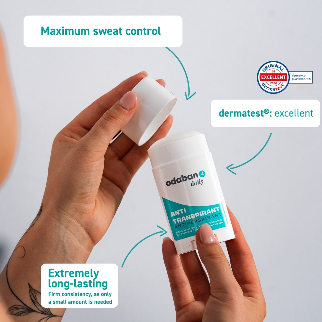 The odaban® antiperspirant is a ‘cosmetic product’. By law, cosmetic products must always be safe. This also applies to pregnant and breastfeeding women. Before being launched on the German market, odaban® underwent several safety assessments, all of which were positive. You can therefore use the odaban® antiperspirant without hesitation during pregnancy and breastfeeding. The odaban® antiperspirant products shouldn´t be used during the day. The simple reason for this is that we sweat more during the day. As a result, the active ingredient aluminium chloride reacts with water to form a by-product, which can cause unpleasant skin irritation. It should therefore not be used during the day. It is also not advisable to use an antiperspirant after freshly shaving your underarms, as this causes extremely small injuries to the skin surface and can cause skin irritation after applying an antiperspirant.