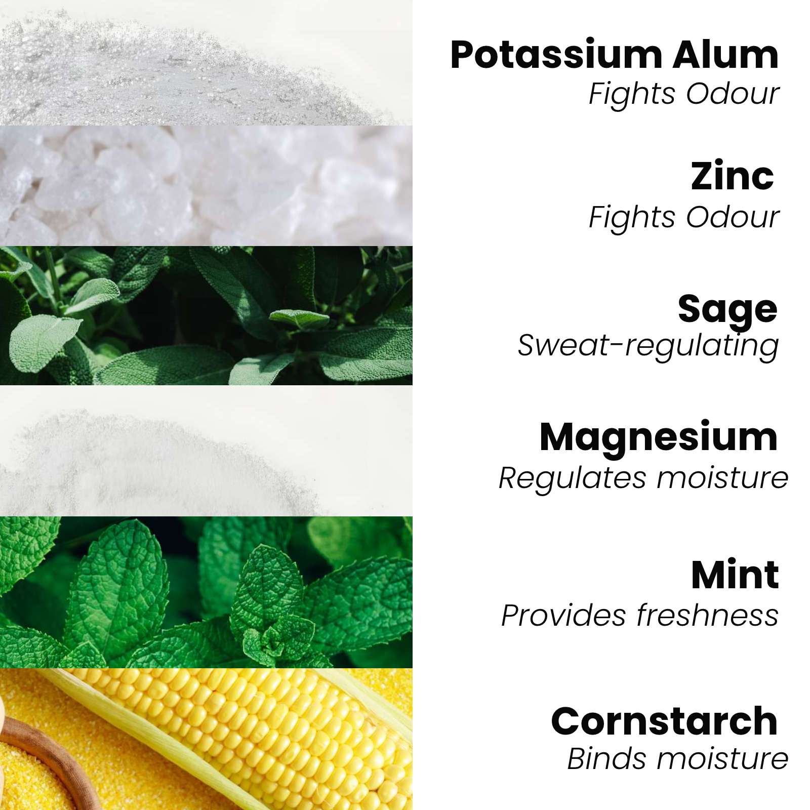 Zea Mays Starch, Potassium Alum, Magnesium Carbonate Hydroxide, Aqua, Zinc Gluconate, Glycerin, Propylene Glycol, Mentha Piperita Leaf Extract, Salvia Officinalis Leaf Extract, Peppermint Leaf Extract.